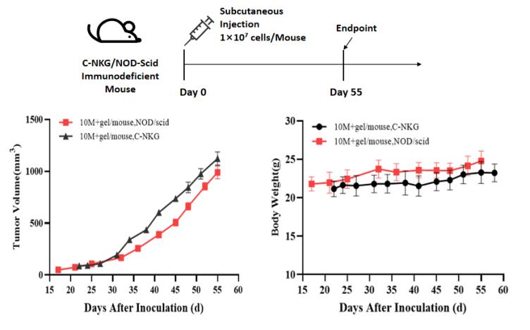 An orthotopic breast cancer model was established by inoculating MDA-MB-231 cells (1×10⁷ cells/mouse) into the mammary fat pads of 7-week-old immunodeficient C-NKG and NOD-Scid mice. Tumor growth was monitored longitudinally, and data are expressed as mean ± SEM. The model exhibited consistent and efficient tumor engraftment in both mouse strains. Tumor volume progression followed a predictable kinetic profile, reaching an estimated 100-200 mm³ by day 25 and achieving the study endpoint volume of 1000 mm³ by day 55 post-inoculation. Based on this growth kinetics, the therapeutic intervention window was projected to commence around day 30.