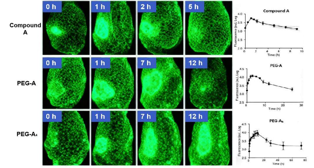 Fig. 2 Retention of compound A and PEG-A nanocarriers in the mammary glands of tumor-bearing rats. Each data point represents the mean ± standard deviation (n = 3). (Source: Alfa Cytology)