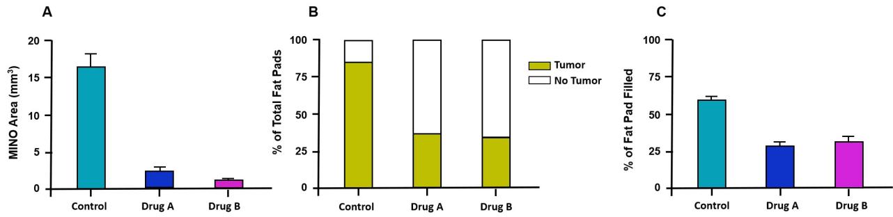 Fig. 2 Effect of the selective estrogen receptor modulator (SERM) treatments. (A) The amount of MIN-O tissue treated with drug A or drug B was significantly less than that of untreated mice (p < 0.0001). (B) p = 0.0008 for drug A and p = 0.0011 for drug B. (C) The drug A-treated and drug B-treated MIN-Os were significantly smaller than the untreated MIN-Os (p < 0.0001). (Source: Alfa Cytology)