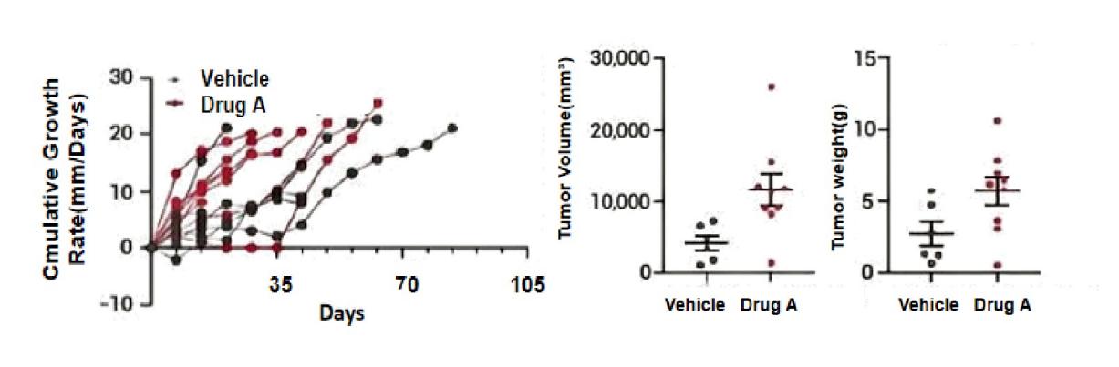 • Accelerated Tumor Growth: Compared to the control group, the drug A treatment group exhibited a significantly faster tumor growth rate, indicating a potential tumor-promoting effect under the experimental conditions.